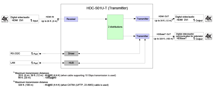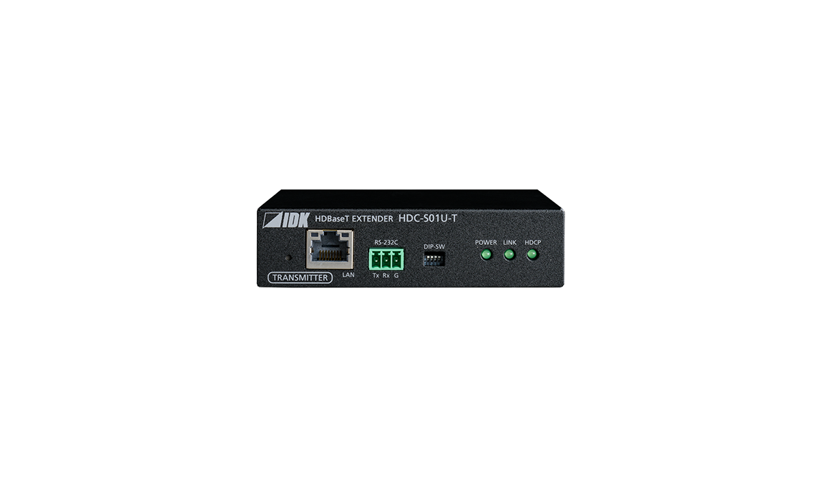 The HDC-S01U-T (transmitter)/HDC-S01U-R (receiver) is an HDBaseT extender for sending HDMI signals up to 328 ft. (100 m) over a Category (CAT) cable without compression or processing. The HDC-S01U-T/R supports video signals at resolutions up to 4K@60 (4:4:4) and is HDCP 2.2 compliant. With Long reach mode, 1080p (24 bit) video signal can be transmitted up to 492 ft. (150 m). HDBaseT signal is encrypted robustly by copyright protection technology. Integrator-friendly features include bidirectional RS-232C and 1GbE LAN communication allowing control commands and status to be sent and monitored. Additionally, the HDC-S01U-T includes a local HDMI output connector for real-time video monitoring.