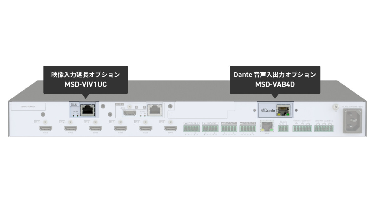 With six (6) HDMI/DVI video inputs, this MSD-V6 can accept a wide variety of video formats, including HDCP content. Input video signals are output as HDMI signals at up to 4K@60, and these signals can be output simultaneously to optional 10GbE CAT(SDVoE)/10GbE FIBER(SDVoE)/HDBaseT for video extension.