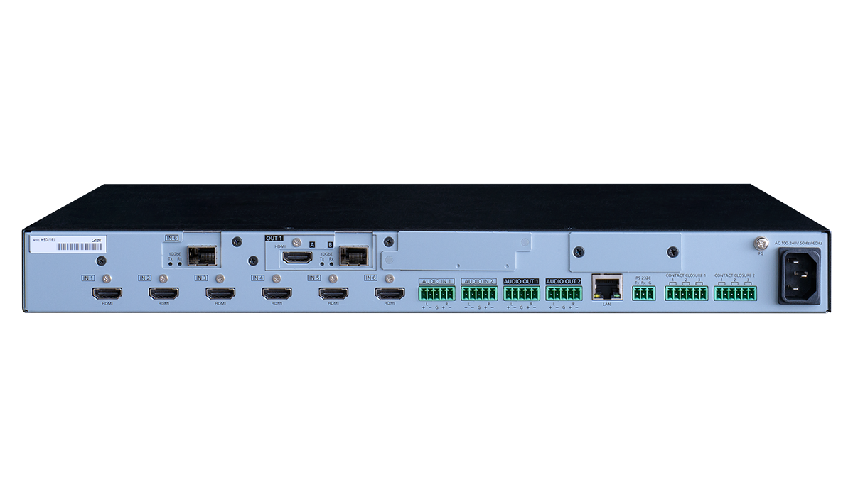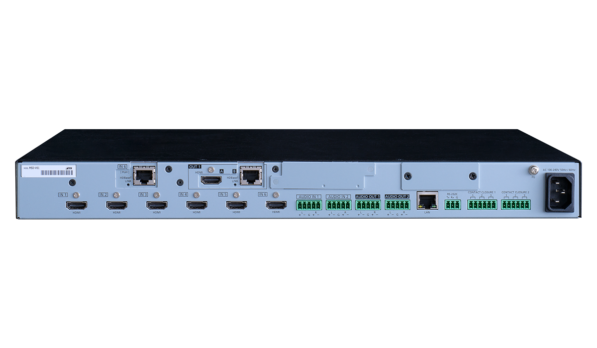 The MSD-V6 includes six (6) HDMI and two (2) analog audio inputs. For audio output, both digital and analog audio are supported and can be distributed simultaneously as well as embedded/de-embedded for breakaway audio routing. Up to four (4) Dante inputs and four (4) Dante outputs can be added.