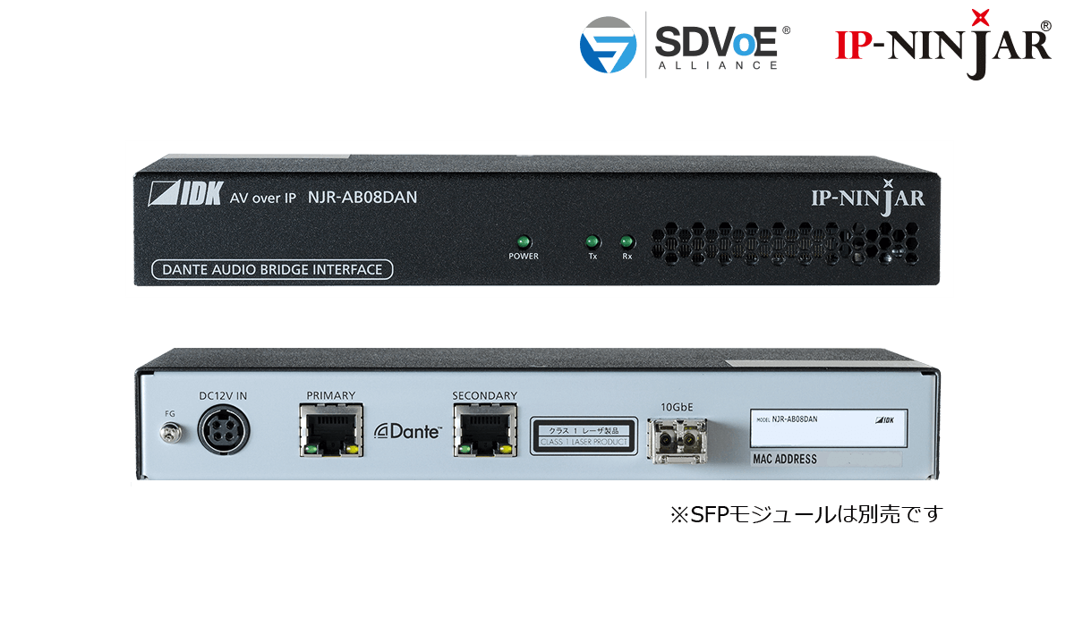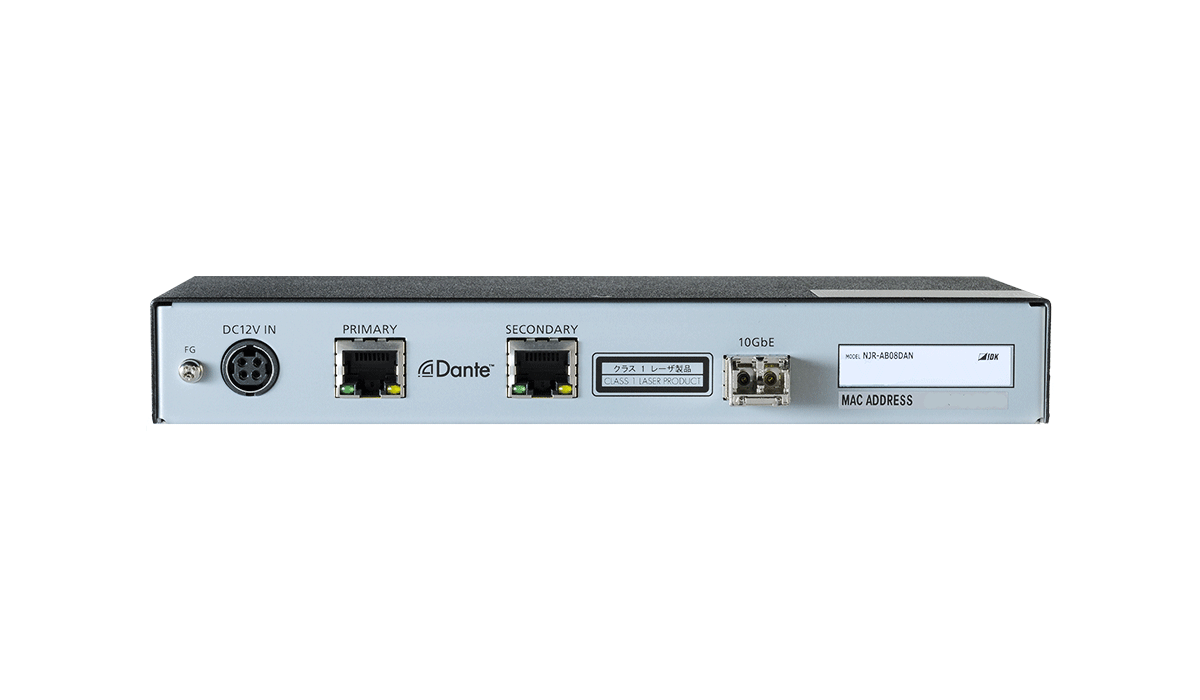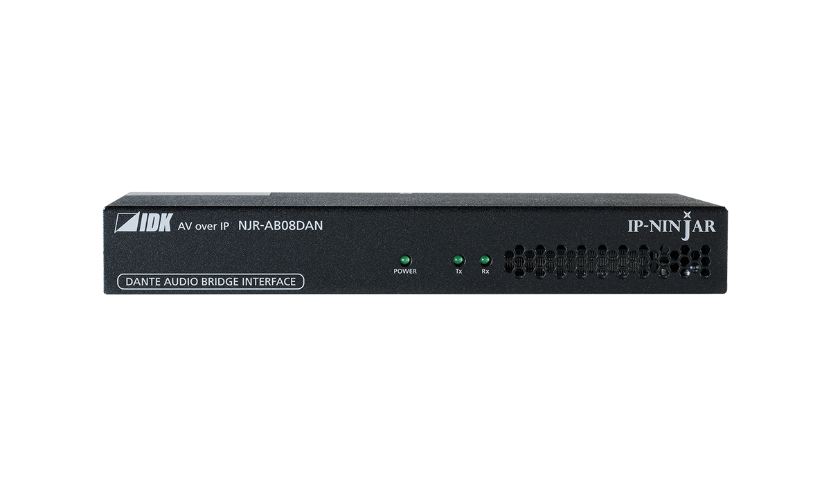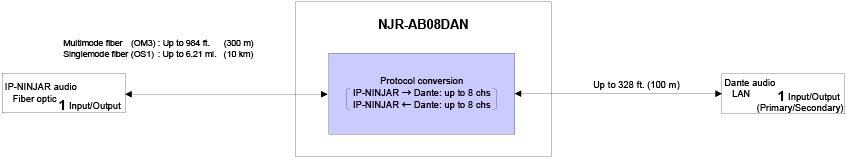 The NJR-AB08DAN transcodes audio signal directly between the IP-NINJAR and Dante protocol environments.