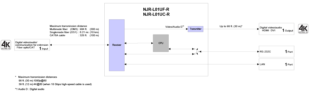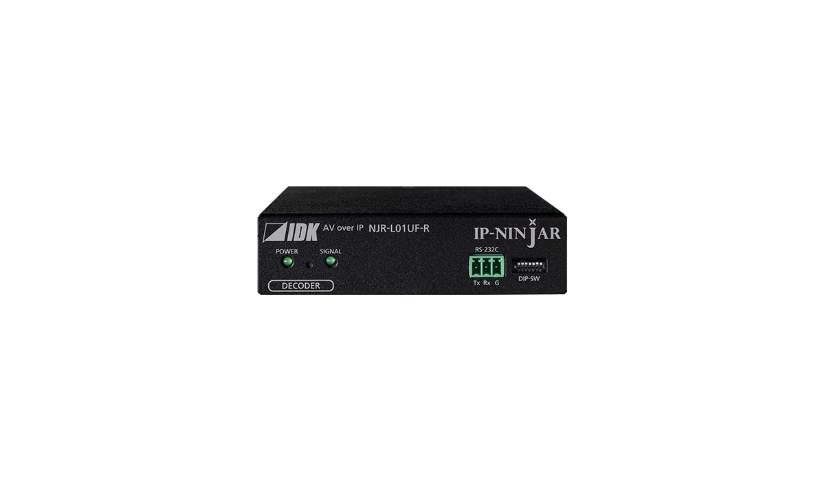 The NJR-L01UF-T(Encoder)/NJR-L01UF-R(Decoder) is an AV over IP encoder/decoder set for transmitting HDMI signals via fiber optic cables.