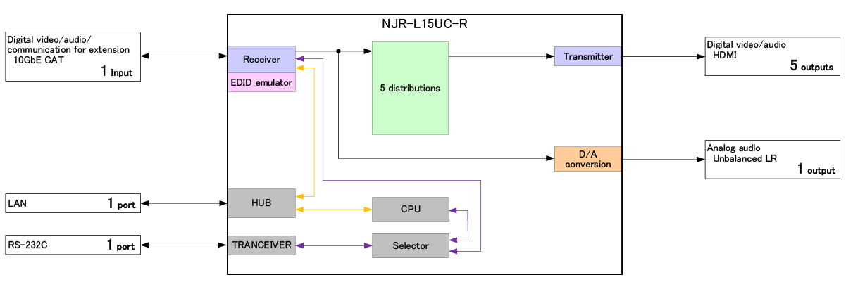 The NJR-L13UC-T(encoder)/NJR-L15UC-T(encoder)/NJR-L13UC-R(decoder)/NJR-L15UC-R(decoder) are AV over IP endpoints with EDID emulator for transmitting HDMI signals over a twisted pair cable. It supports 4K@60 signals and is HDCP 2.2 compliant.
