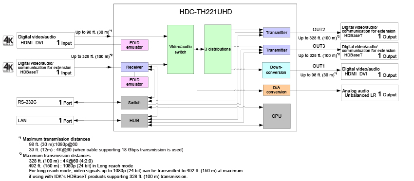 | Maximum transmission distances | Digital input | HDMI/DVI: 98 ft. (30 m) (1080p@60), 39 ft. (12 m) (4K@60) HDBaseT: 328 ft. (100 m), 492 ft. (150 m) (Long reach mode is used) |