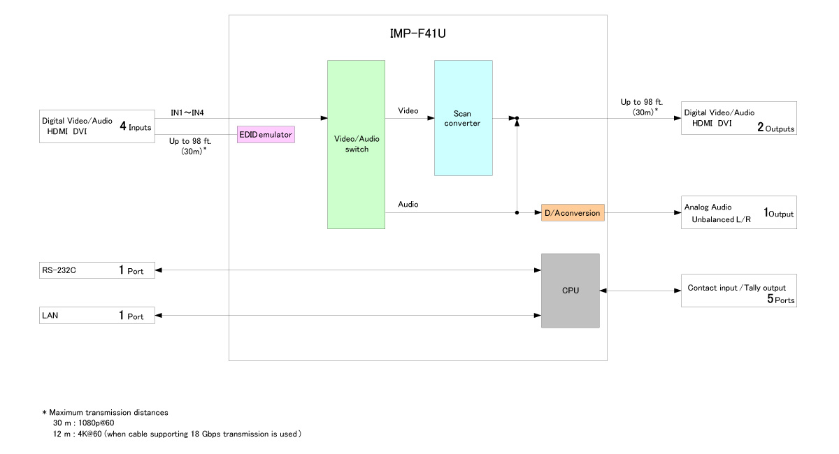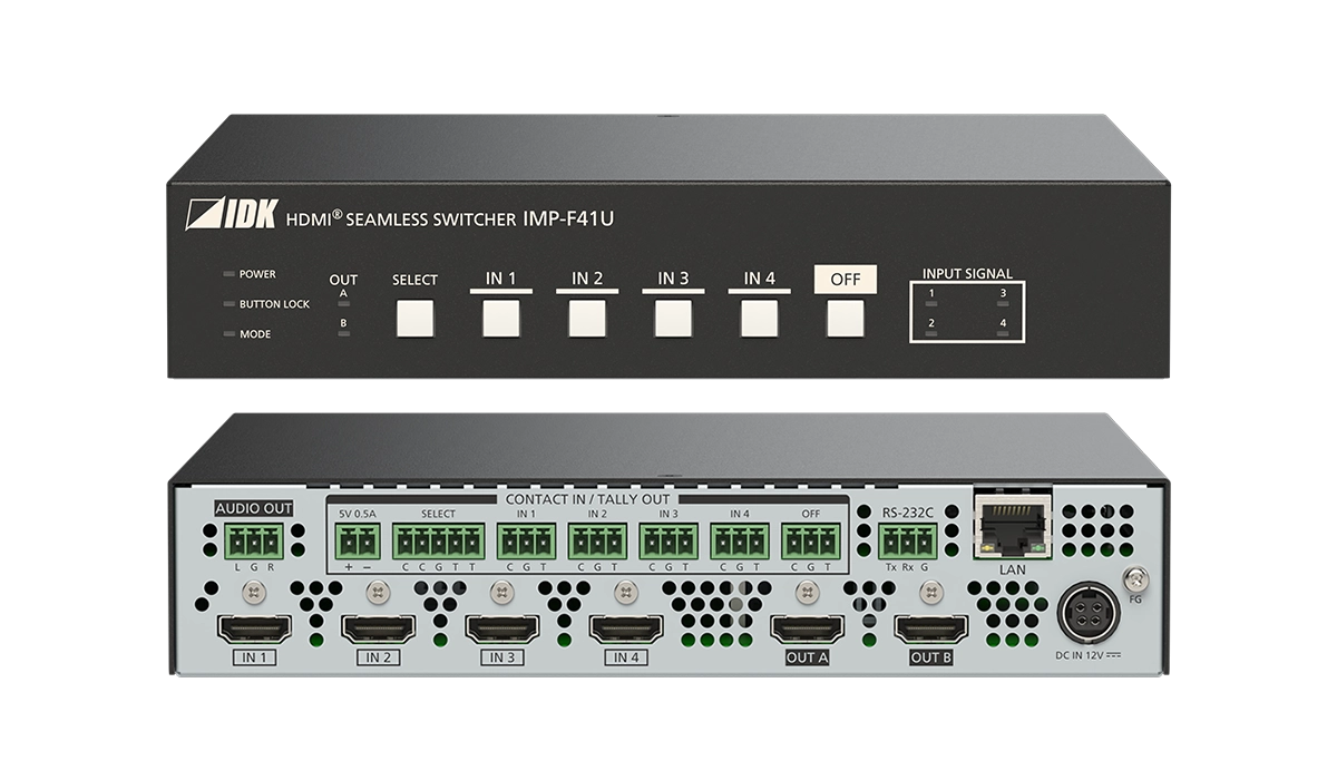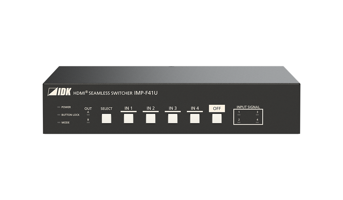 The IMP-F41U is an HDMI seamless switcher with four (4) HDMI inputs, supports video resolutions up to 4K@60, and HDCP content to the two (2) available HDMI outputs. Output image is mirrored acting as an HDMI DA to help distribute video across the AV system.