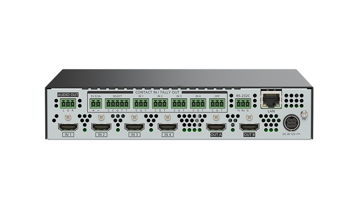 The switcher also includes RS-232C and LAN as communication ports that offer remote control and monitoring from the WEB browser or via control commands.