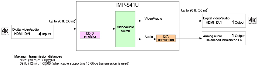 | Maximum transmission distances | Digital input | 98 ft. (30 m) (1080p@60), 39 ft. 12 m (4K@60) |