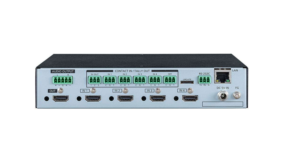 The switcher also includes RS-232C and LAN as communication ports that offer remote setting from WEB browser or control commands. Additionally, contact inputs/tally outputs enable the IMP-S41U to be controlled from the PC I/O board and a control box. Close