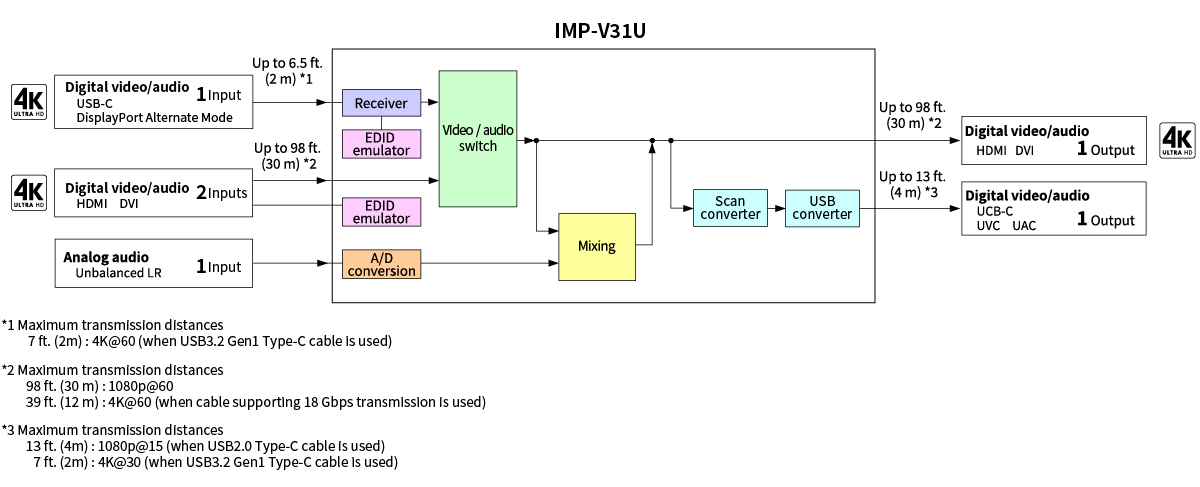 For audio input, the IMP-V31U provides two (2) HDMI, one (1) USB-C, and one (1) analog audio inputs. Analog audio can be mixed with digital audio of the selected input channel. The selected input audio signals are distributed to both HDMI and USB-C outputs.