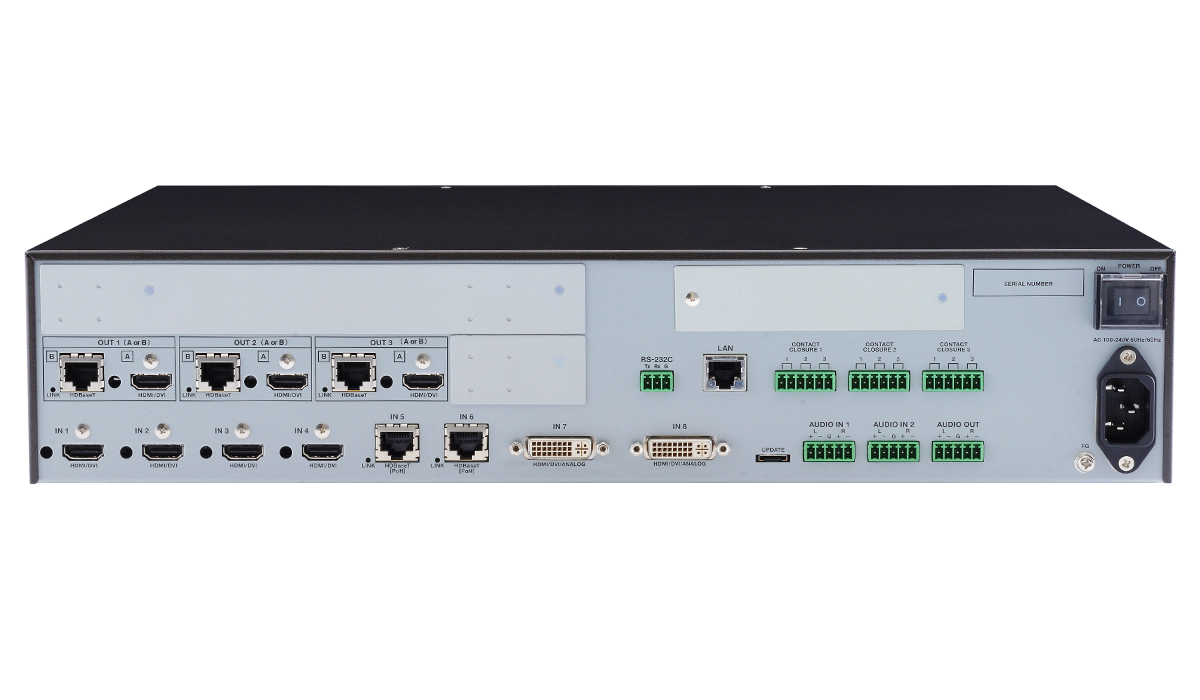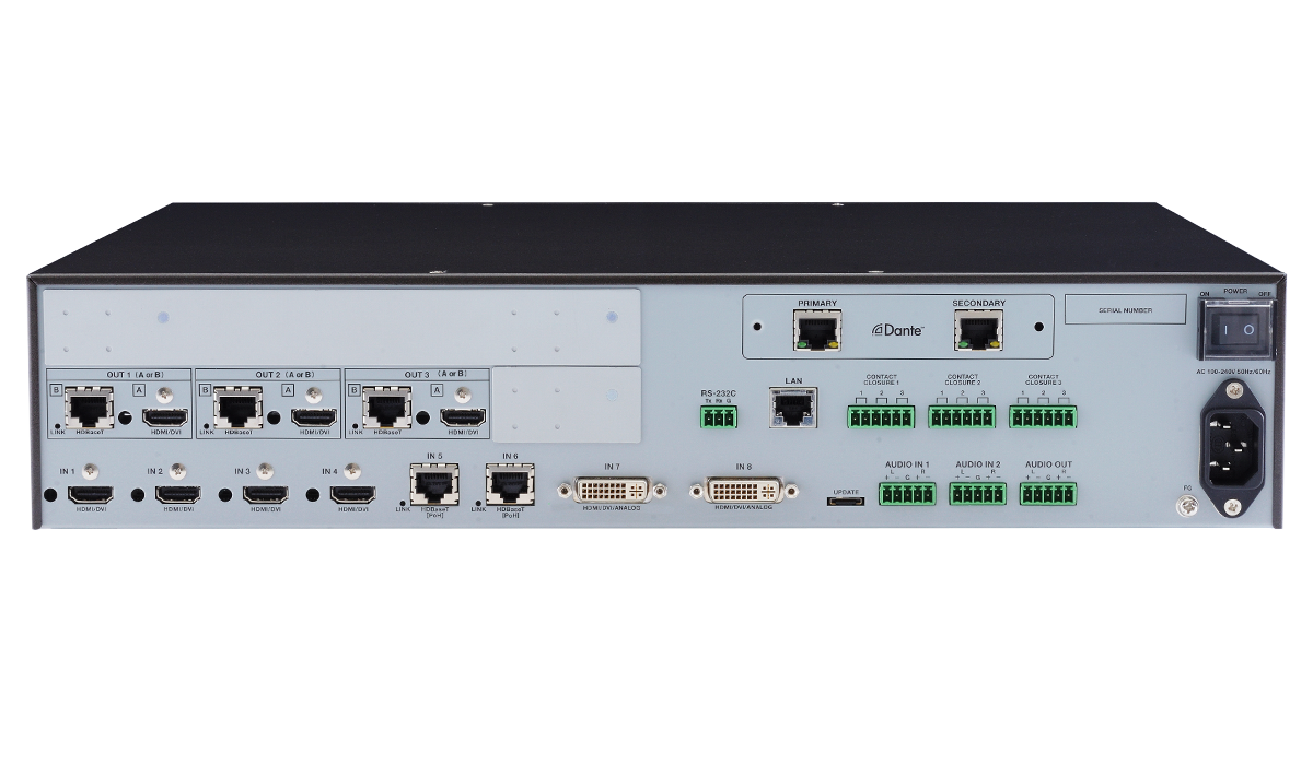 For video input, 8 digital and 2 analog inputs are included and the following signals are supported: HDMI, DVI, HDBaseT, composite video, Y/C, analog RGB, and analog YPbPr signals. HDBaseT input supports Power over HDBaseT (PoH) that can power the connected devices. Input video signals are converted to HDMI/DVI or HDBaseT signals and output at a resolution up to 4K@30.