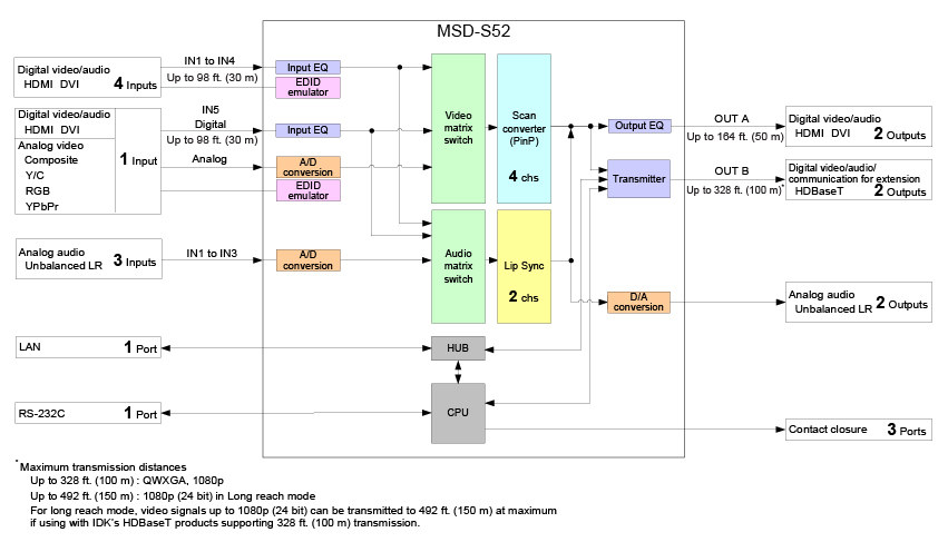 | Digital output | HDMI/DVI : 164 ft. (50 m) HDBaseT : 328 ft. (100 m), 492 ft. (150 m) (Long reach mode is used) |