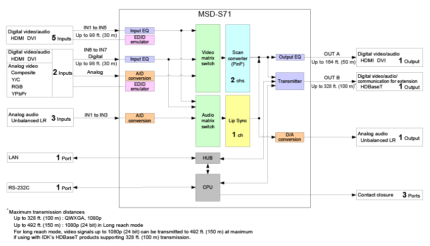 HDBaseT : 328 ft. (100 m), 492 ft. (150 m) (Long reach mode is used)