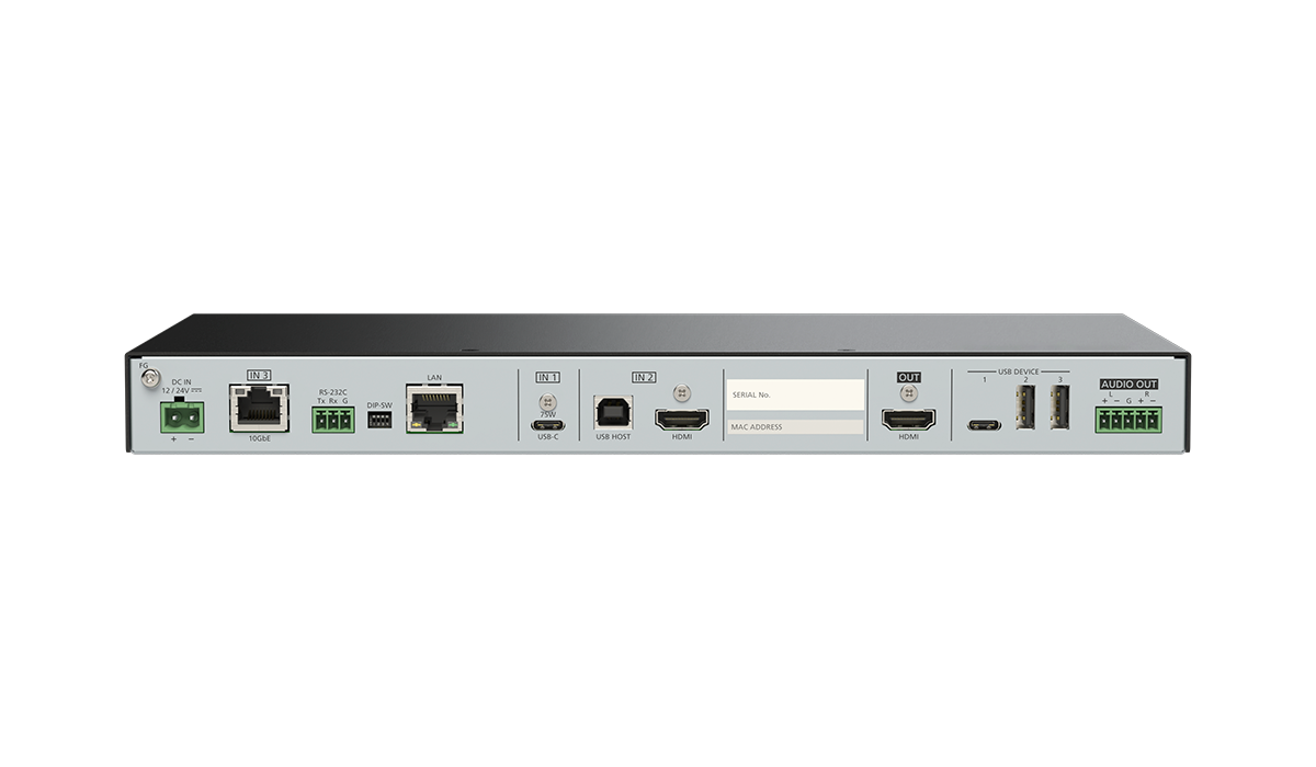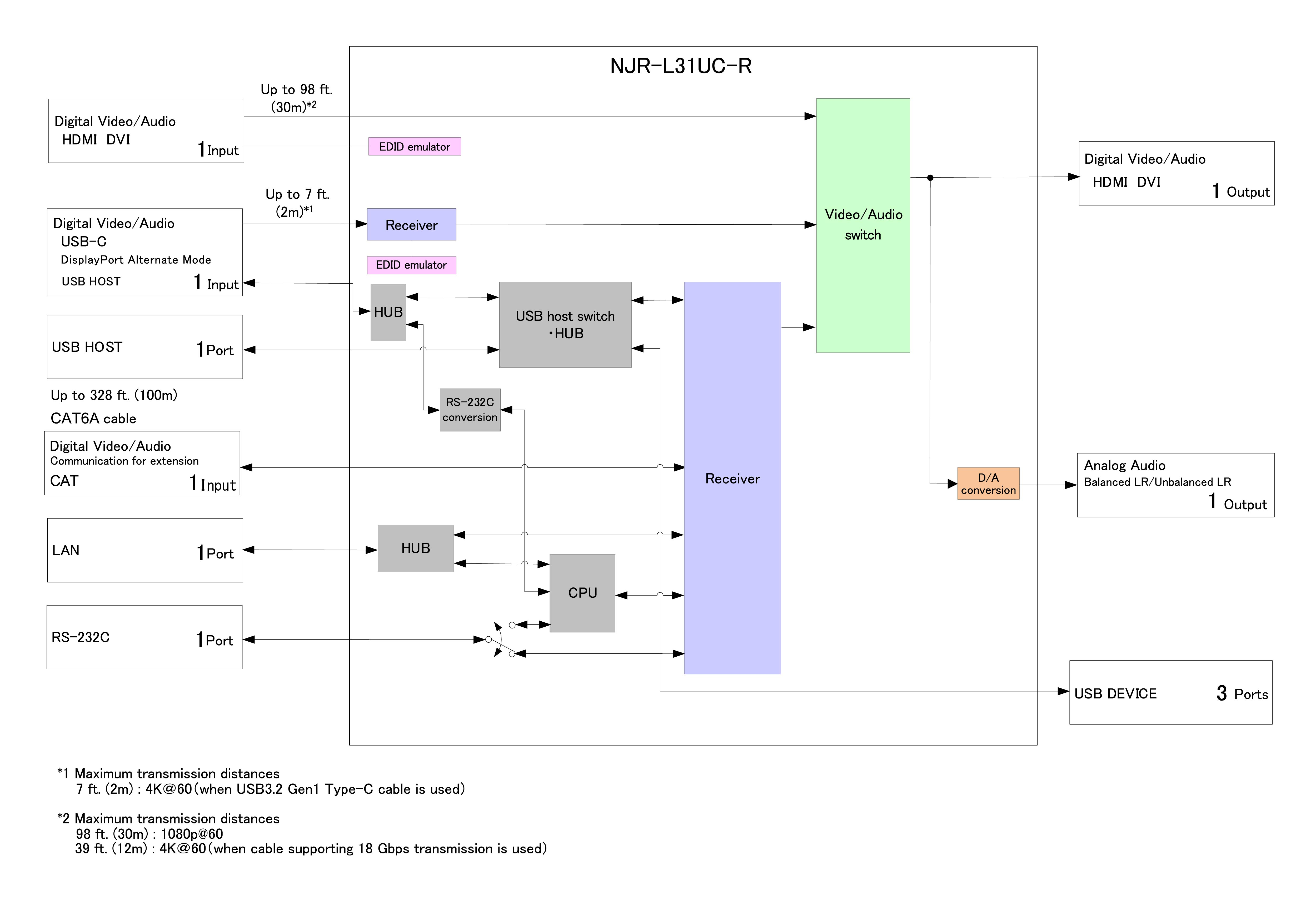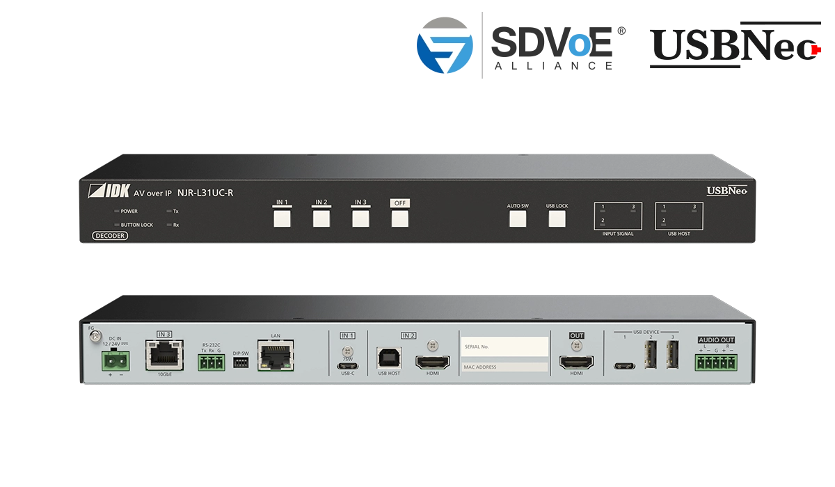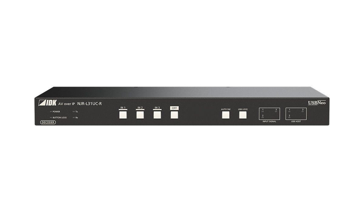 The NJR-L21UC-T/NJR-L31UC-R are an encoder/decoder set for transmitting HDMI and USB-C video signals, RS-232C, LAN, and USB (HID) over CAT6A for point-to-point or AV over IP distribution. The NJR supports video resolutions up to 4K@60 (4:4:4) and is HDCP 2.2 compliant.