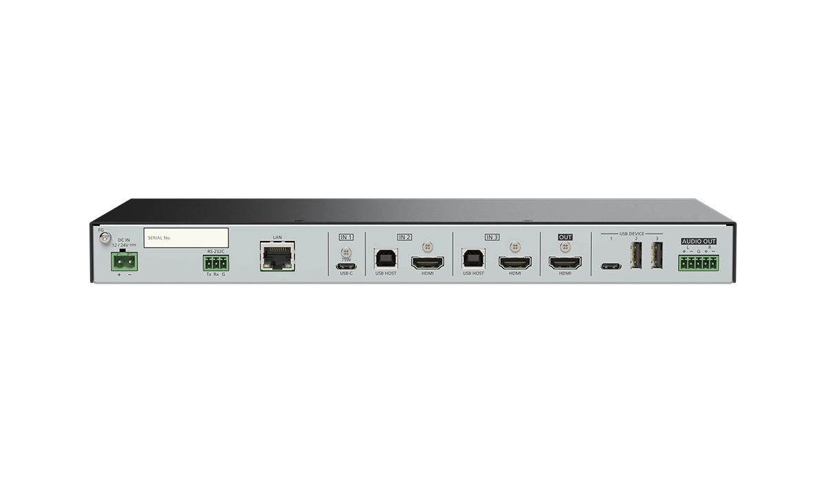 For video inputs, the switcher includes one (1) USB-C and two (2) HDMI inputs, one of which can be selected and output out through the local HDMI output.