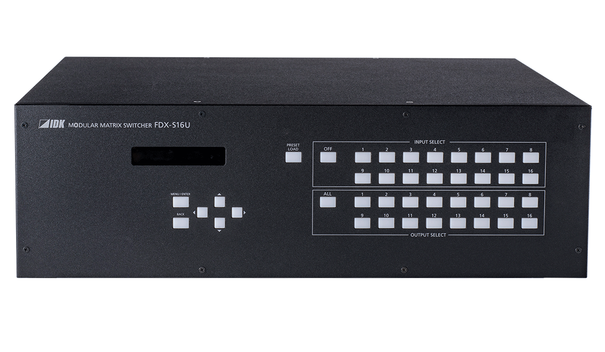 The FDX-S16U is an HDCP 2.2-compliant modular digital matrix switcher that supports resolutions up to 4K@60. It provides up to 16 inputs and 16 outputs.