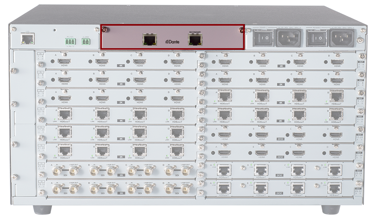 The FDX-SAB64D is a Dante network audio board designed for FDX-S series Modular Matrix Switchers. Close