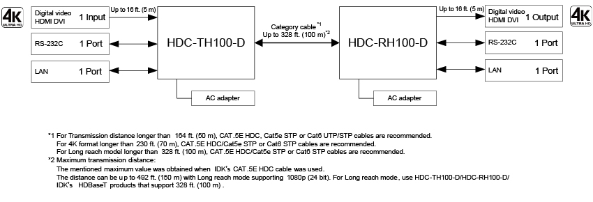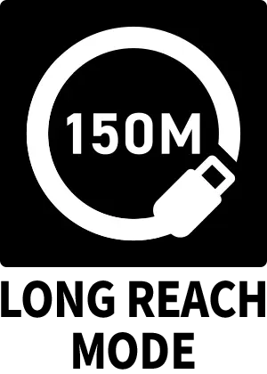 | Maximum transmission distances | 328 ft. (100 m) (For 4K format, CAT.5E HDC, Cat5e STP, or Cat6 STP cable is used) 492 ft. (150 m) (Long reach mode is used) |