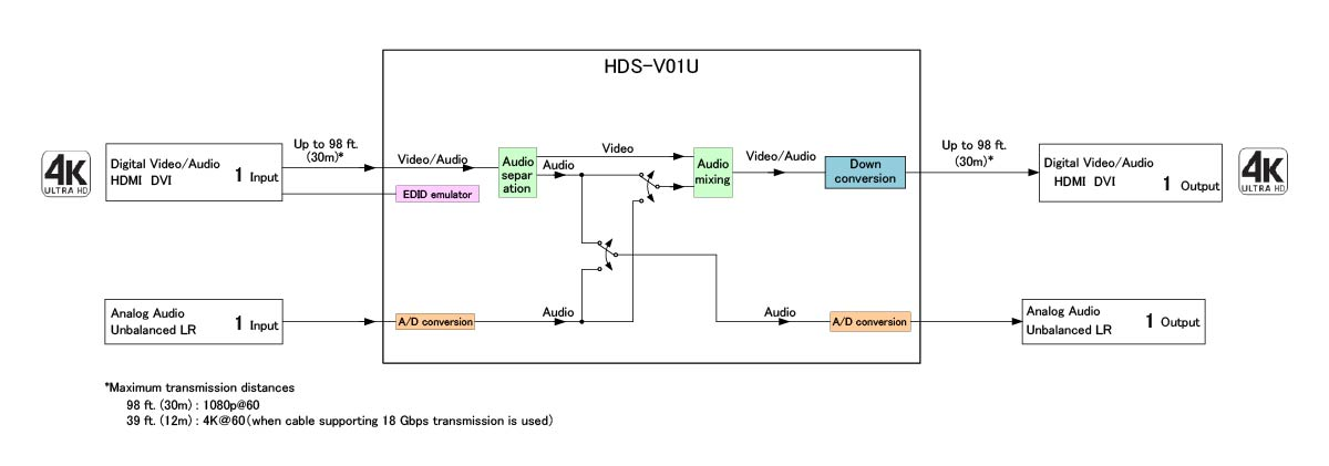 The HDS-V01U allows digital audio to be converted into analog audio and analog audio to be converted into digital audio and output together as an HDMI signal.