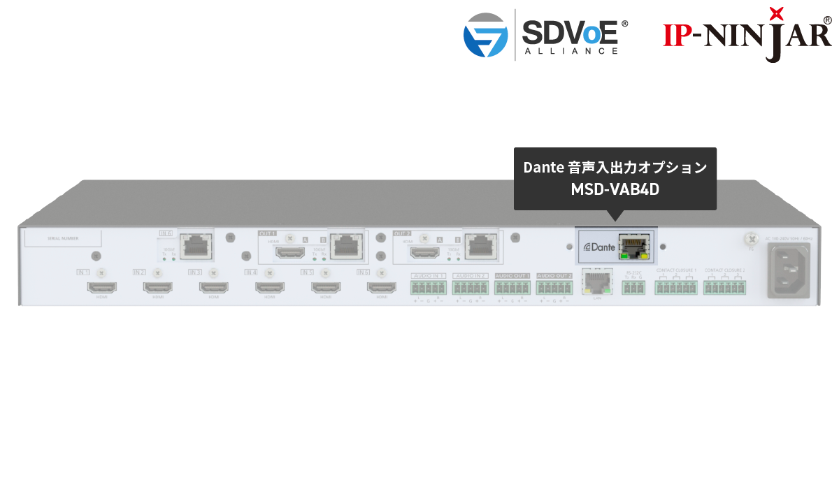 The MSD-VAB4D is a modular Dante audio option that is a factory-installed and supports up to four (4) input and four (4) output audio signals. Stereo pairs (left and right audio channels) can be transmitted to two (2) inputs and two (2) outputs, respectively.