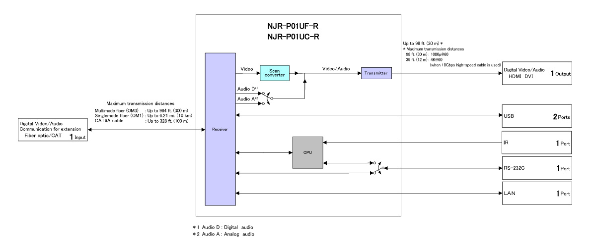 The NJR-P01UC is an AV over IP solution for high definition signal transmission via category cables.