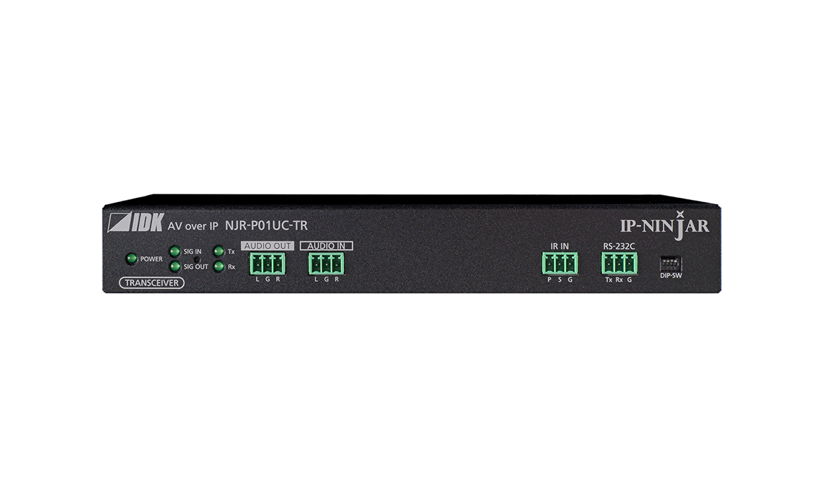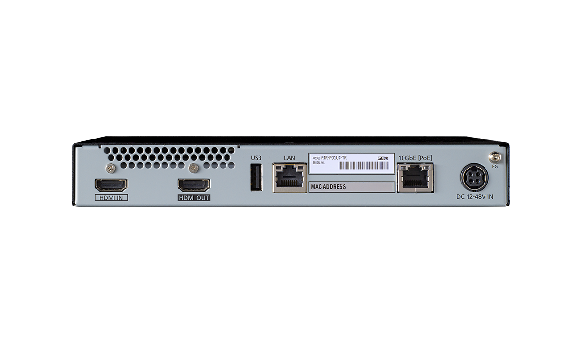 The NJR-P01UC-TR is a transceiver for transmitting and receiving 4K@60 HDMI signals simultaneously over a 10GbE AV over IP network via twisted pair cables. Bidirectional RS-232C communication, LAN, USB (HID) such as KVM can be carried over the same twisted pair cable for extension.