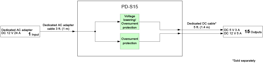By using a dedicated DC power cable (sold separately), the PD-S15 supplies power to up to 15 IDK products which operate via an AC adapter.