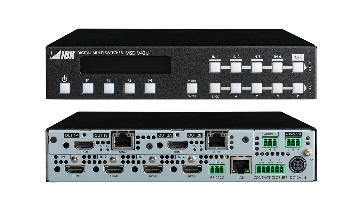 With four (4) HDMI/DVI video inputs, the series can accept a wide variety of video formats. Input video signals are output as HDMI signals at up to 4K@60 (4:4:4). The MSD-V41UC/V42UC and MSD-V41UT/V42UT distribute signals in HDMI format and either 10GbE (SDVoE) or HDBaseT simultaneously.