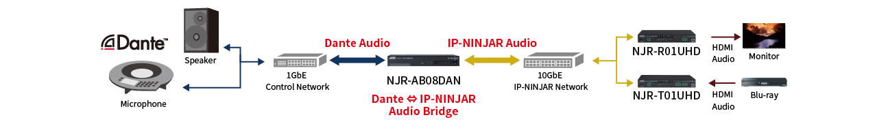 IP-NINJAR uses proprietary codec to distribute audio, and it can route audio signals only in IP-NINJAR Network. NJR-AB08DAN provides ability to convert and bridge audio signals between Dante Audio and IP-NINJAR Audio.